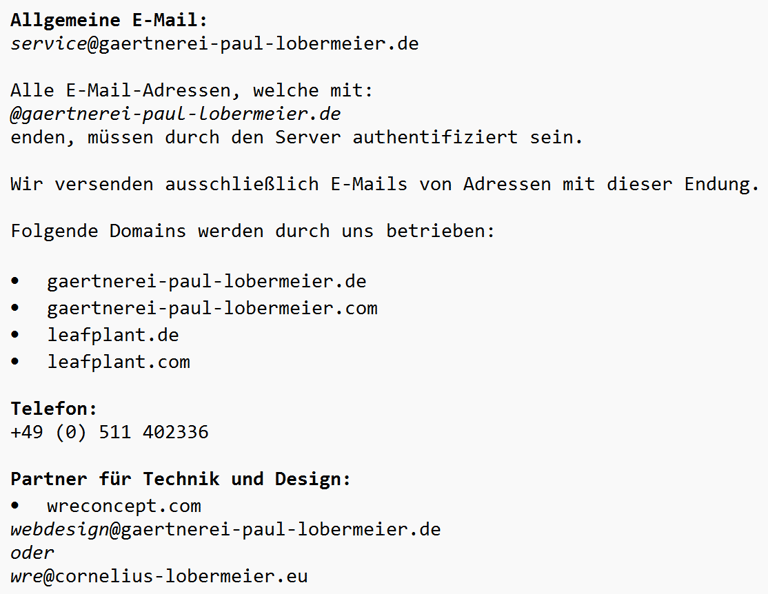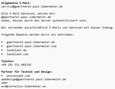 Für eine sichere Kommunikation mit unserem Unternehmen empfehlen wir die Kontaktaufnahme über unsere Webseite: https://gaertnerei-paul-lobermeier.de/kontakt